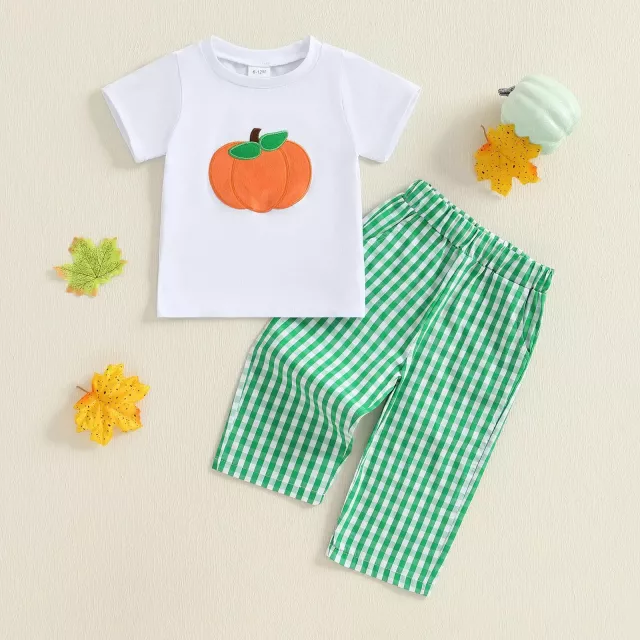 Get your little one ready for a fun and festive season with this 2-piece toddler boy Halloween outfit. Featuring a soft short-sleeve top with charming pumpkin embroidery and matching plaid pants, this set combines comfort with playful holiday spirit. Designed with breathable cotton blend fabric, it ensures your child stays cozy while looking irresistibly cute, whether it’s Halloween night, a family outing, or everyday play.